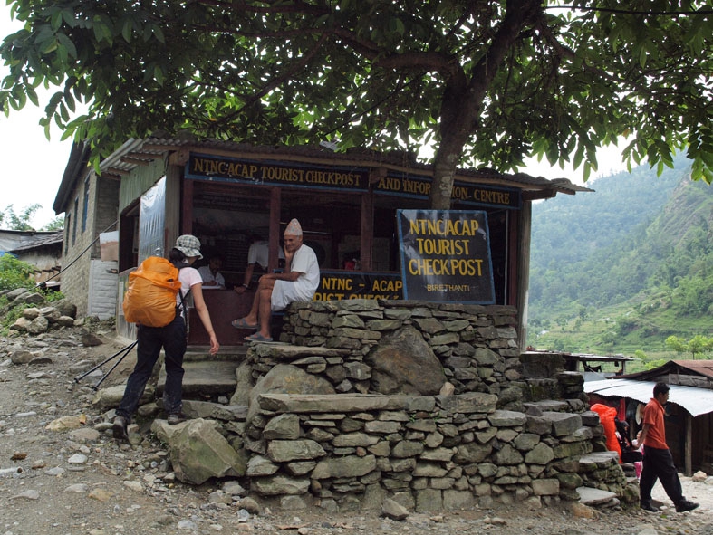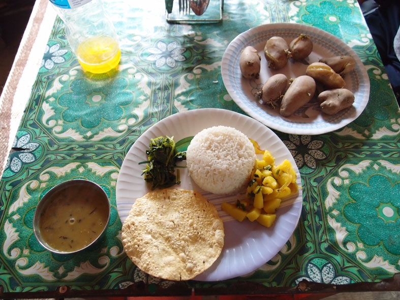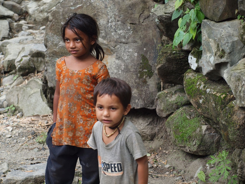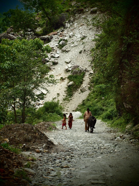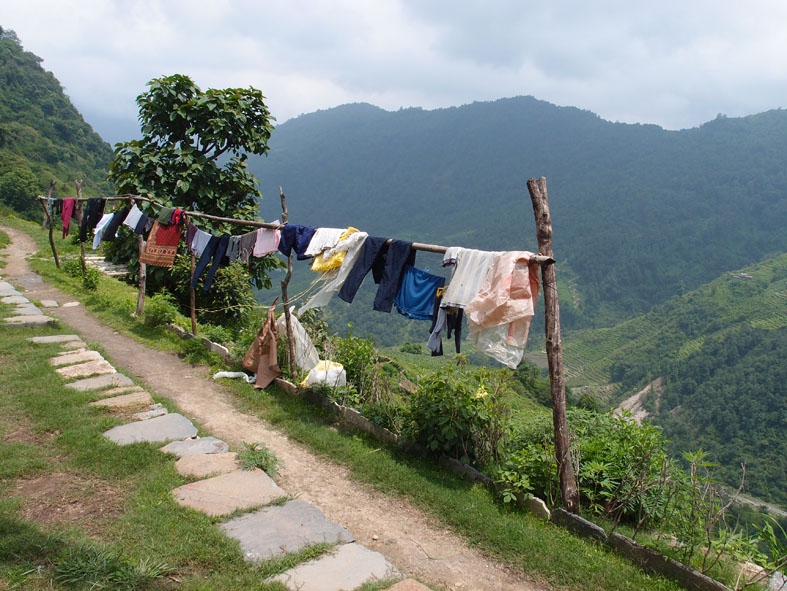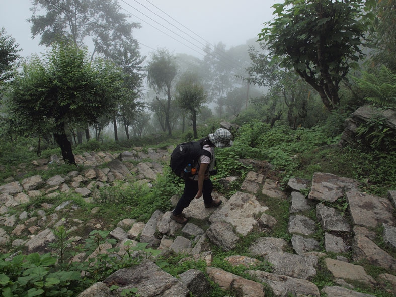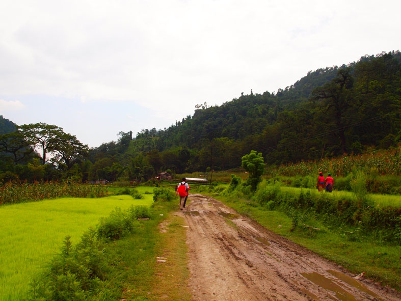 トレッキング初日。タクシーで出発地点の「NAYAPUL」へ向かう。「まずはお茶など…」と出発の気配さえ見せない我ら。重い腰を上げると荷物がかなり重かった。あまりの荷物の重さにチェックポイントに向かうまでにすでに後悔をし始めていた。そんなこんなでのんびり歩いていたら、宿泊予定地の「ULLERI」には到底着けそうもないことが判明。ペースを上げるも、最後の階段がきつすぎるわ、雨が降り始めるわで、結局、「ULLERI」の端っこの宿に泊まったのであった。