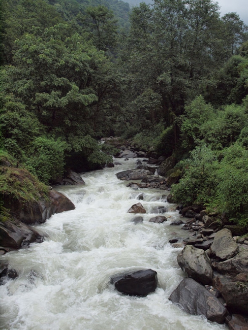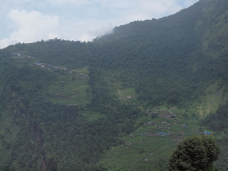地図で見ると目的地の「CHOMRONG」は標高的には低い所にある。しかし、道中大きな川がある。そこを橋で渡って越えるということは、いったん一気に下ってまた上がるということなのだろう。「どうせ、なだらかな下り坂というわけじゃないんだろぉ!」ここまで来るとなんとなくトレッキングというものがわかってきた…最初は晴れて気持ちの良かった日差しも、後半は急に姿を隠し代わりに豪雨がやってきた。本日も盛りだくさんな一日であった。