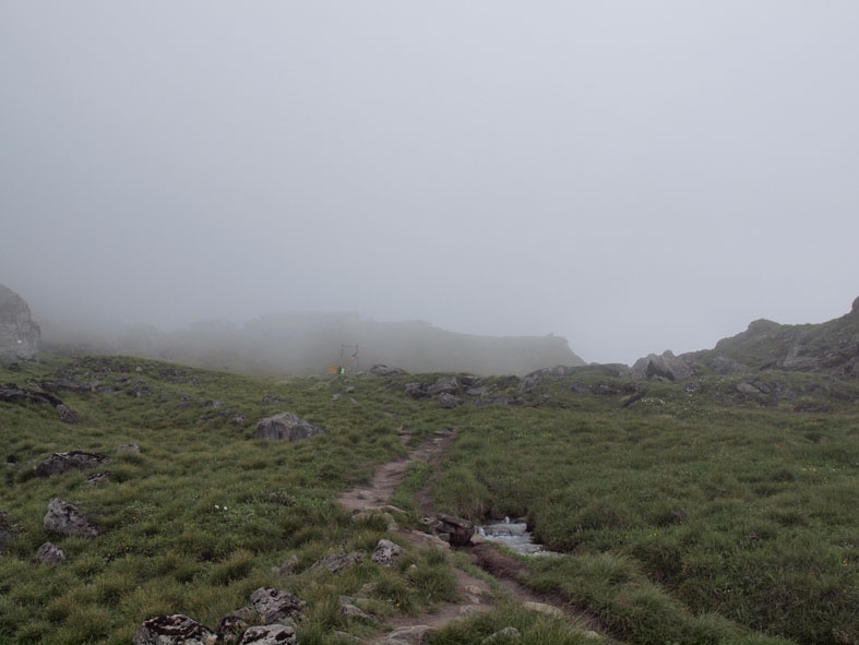 本日が最後の登り。長かったトレッキングももはや佳境を迎えている。羊たちの群れを避け、モディコーラ沿いをひたすら歩く。道中アイスバーンがあって、その上を通過しなければならないのだが、足を滑らすと激流のモディコーラに真っ逆さま!という場所がある。脚を震わせながらなんとか通過してしばし歩き続けると「マチャプチャレ B.C」に到着する。そこから最終目的地の「アンナプルナ B.C」までは1時間強だ。思いのほか緩やかな道。脇には小さな川が流れている。霧が濃くて周囲を見渡すことはできないが、これまでの風景とは違うのがわかる。もうゴールは近い!
