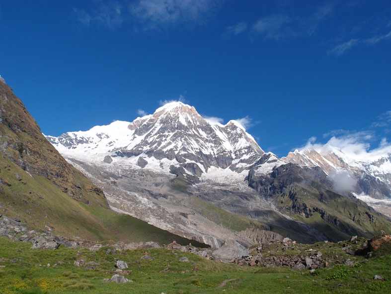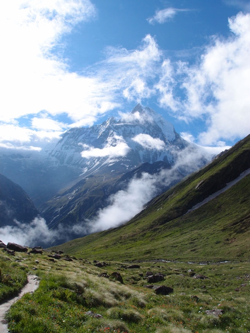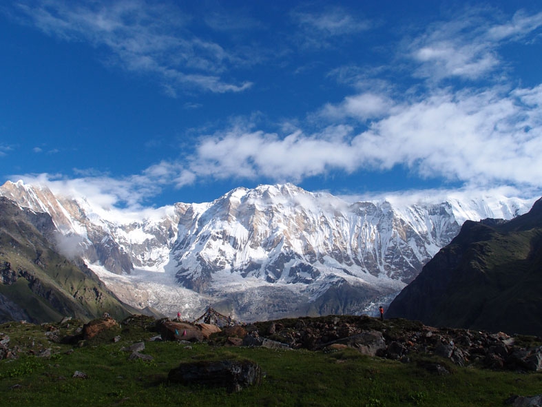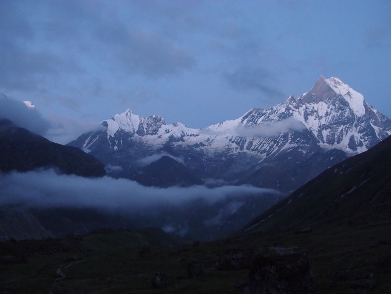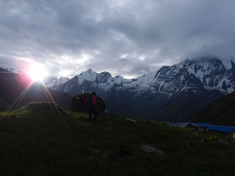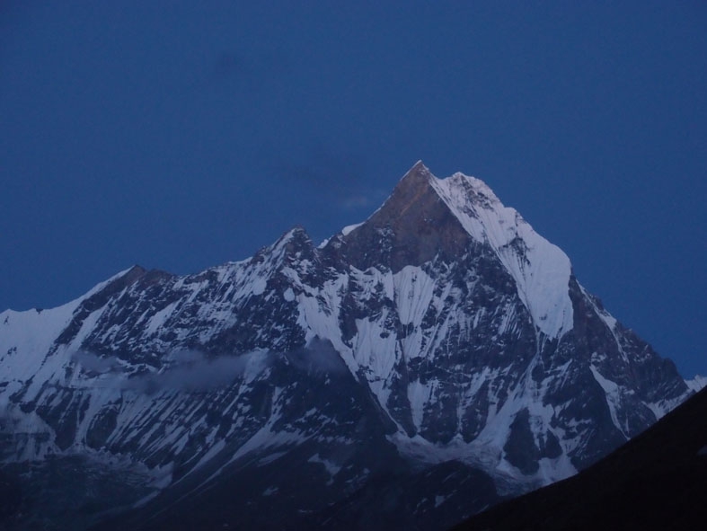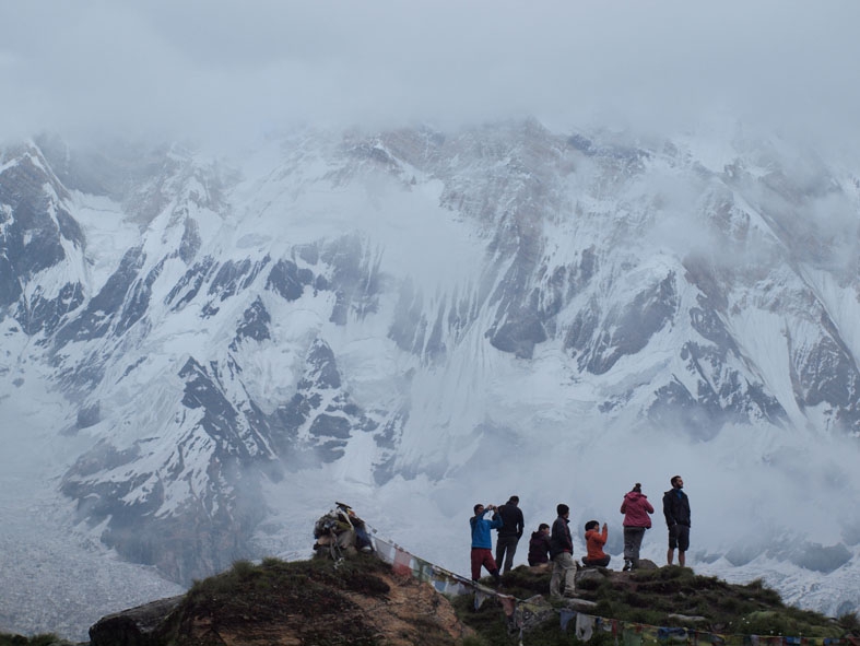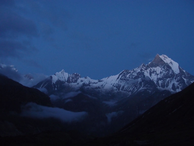 日暮れ間近に奇跡的に霧と雲がとれて我らに姿を見せてくれたヒマラヤの山々。今朝もその勇姿を我らに見せてくれた。360度ヒマラヤの山々に囲まれて誰もが見惚れている。大きすぎる自然に触れ喜び驚き畏れ戦く。「マチャプチャレ B.C」までの道もとてもきれいだった。昨日は濃い霧のせいで周囲を見渡すことができなかったのだが、実はマチャプチャレを背負って歩いていたのだ。清らかな小川と色とりどりの小さな花。そして眼前にはマチャプチャレがそびえる。ここまで登って来た者だけが味わうことのできる至福の時だ。