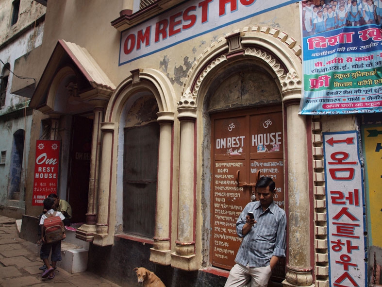 [comment]「オムレスト」にはwifi 環境がなかったので探し当てた宿。スタッフのナットさんは日本語を話す気さくな人。彼の人柄に惹かれて長期滞在してしまった。体調を崩した時も彼や他のスタッフが気遣ってくれたおかげで安心して過ごすことができた。頼めばホットシャワーも使える。ガンガーが見える部屋、ちょっと見える部屋、見えない部屋があって料金はRs50ごとに安くなる。ちなみに泊まったのはちょっと見える部屋。部屋には洗面台のスペースもある。チェックアウトは11時。