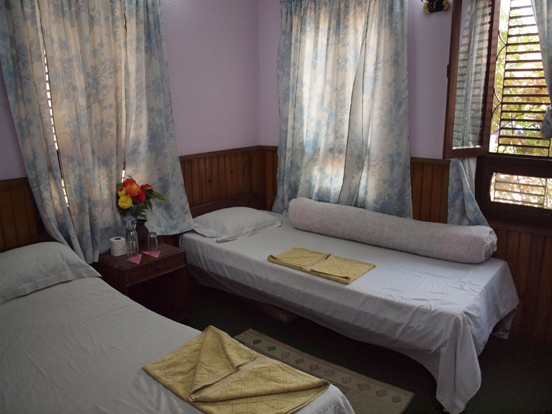 [comment]ツアーで用意された宿。川沿いにあるので目の前が国立公園でテラスからの眺めが良い。象の水浴びがすぐ近くで行われているので便利。宿の前に小さな商店もあるので物資調達もできる。ツアー代金に含まれている食事もおいしい。宿のスタッフも気さく。ただ、水は茶色く鉄錆臭い。湿気の多いせいか部屋も黴臭いのが残念。街の中心からは徒歩10分くらい。