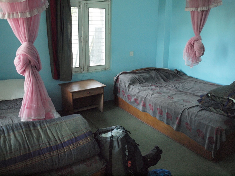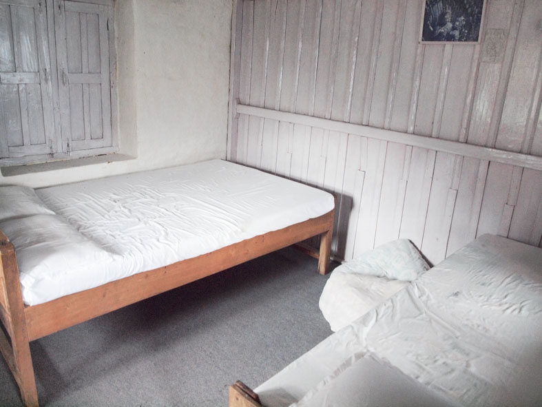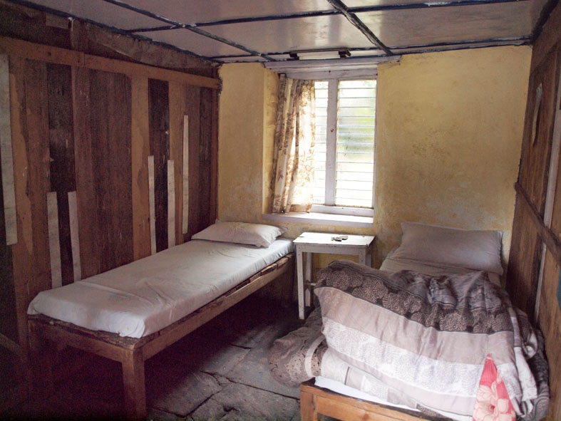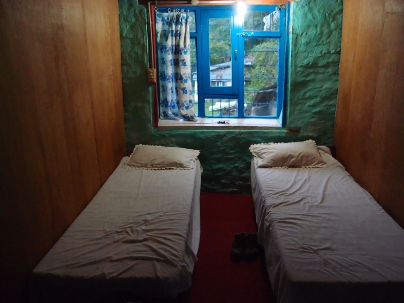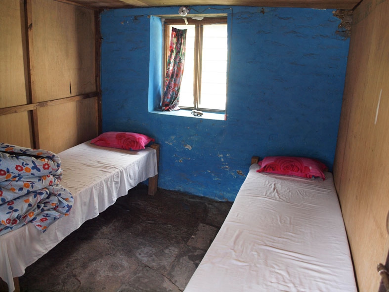[comment]ベースキャンプに着いたら管理人が部屋に連れて行ってくれた。複数の宿の部屋を適当に割り当てているようで、どこの部屋も同じようだった。食堂は1つしか開いておらず、みんなそこで食事をしたりくつろいでいた。夜は電気が付かず、ホットシャワーもないようだった。宿の前からは、360度ヒマラヤの絶景が見渡せる。